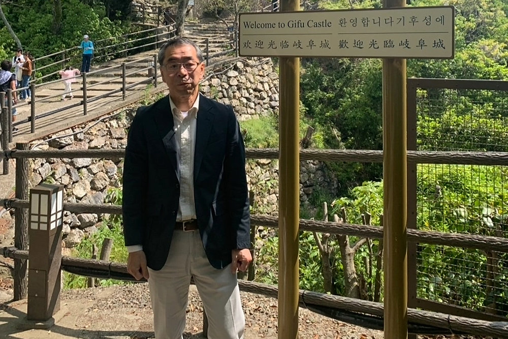 金華山は標高約340mの険しい山、北側は断崖絶壁、眼下には長良川が流れています(山上へは麓からロープウェイに乗り、さらに10分ほど山道を登ります)。